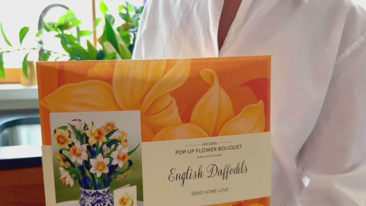 A pop up bouquet of FreshCut Paper Daffodils is a delightful greeting card celebration of uplifting emotions and support. Daffodils are a hardy springtime flower that traditionally symbolize resilience and success. The bright blossoms of this arrangement will outlast normal cut flowers and continue to thrive without any need for water or preservatives. Easy to care for and long-lasting, these flowers will continue to cheer on your special someone for many years to come.