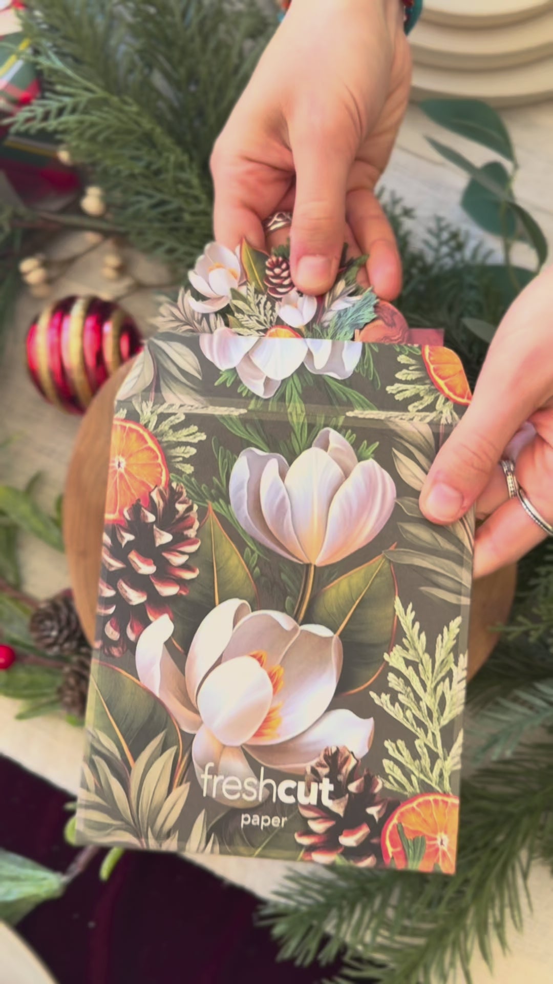 The Mini Pop-Up Winter Magnolia is a petite paper flower bouquet that captures the quiet beauty of the season. Snowy magnolia blooms nestle among pine cones, dried orange slices, and wintry greenery. A thoughtful holiday gift or decorative touch, it’s perfect for a windowsill, Christmas table, mantel, or place setting. Festive yet timeless, this mini pop-up greeting card adds warmth and wonder to any winter celebration — and makes a lovely keepsake to enjoy all year long.