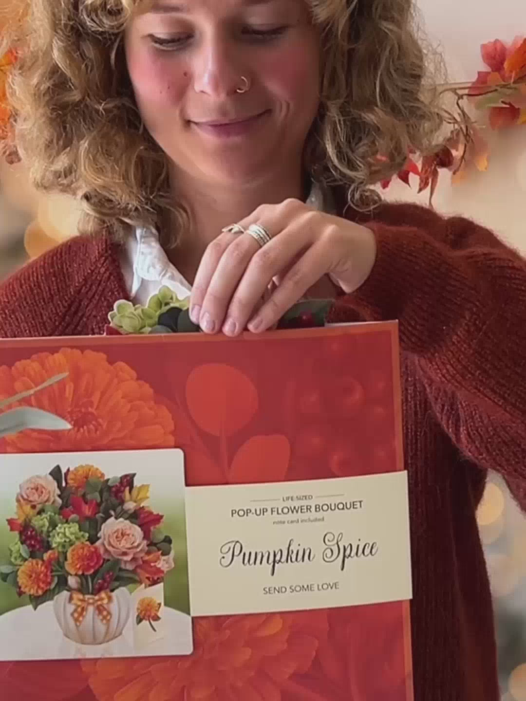 The warmth of autumn’s embrace lasts all year long with FreshCut Paper’s bold and beautiful Pumpkin Spice Bouquet. An opulent expression of sunset hues is seen in these ornately designed marigolds, garden roses, green hydrangeas, eucalyptus, red berries, and maple leaves. A nostalgic gingham bow enhances the sunshine shades, while a white pumpkin vase adds an elegant and minimalist touch. Comprised of symbols of change, renewal, friendship, and love, the Pumpkin Spice Bouquet is a gourd-ous centerpiece and charming way to send your love.