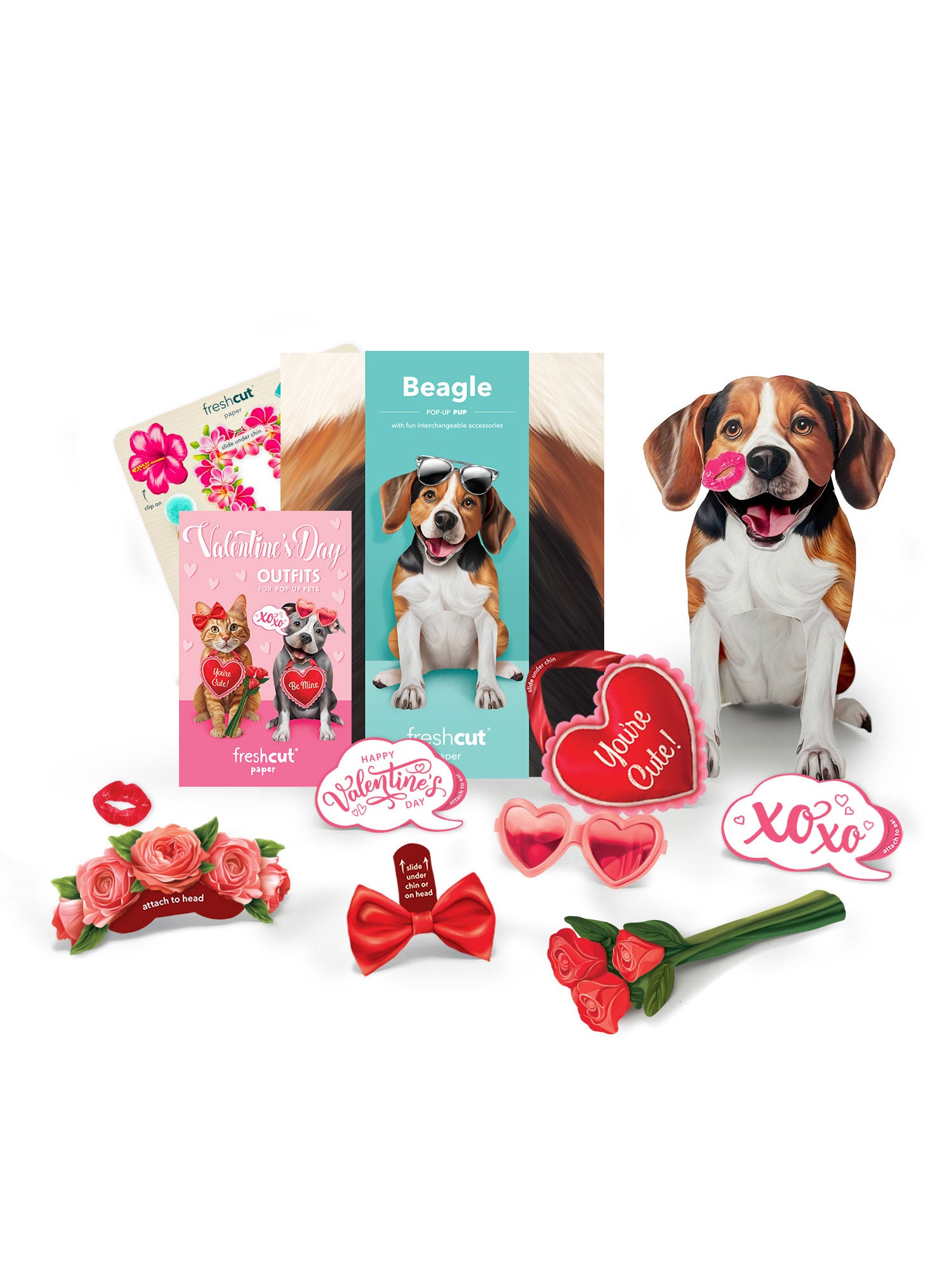 Valentine's Day Beagle 3D Pop-Up Card captures the breed’s playful spirit, bringing a touch of joy, warmth, and mischief to any space they pop up in with their floppy ears and boundless enthusiasm. Comes with interchangeable Valentine-themed accessories, a matching notecard, a mailing envelope, and a customizable speech bubble to add your own personalized message.