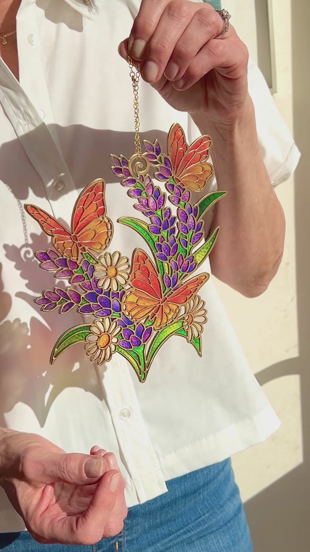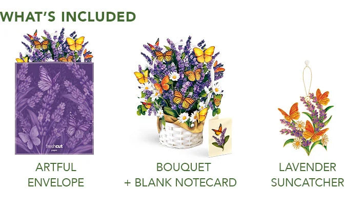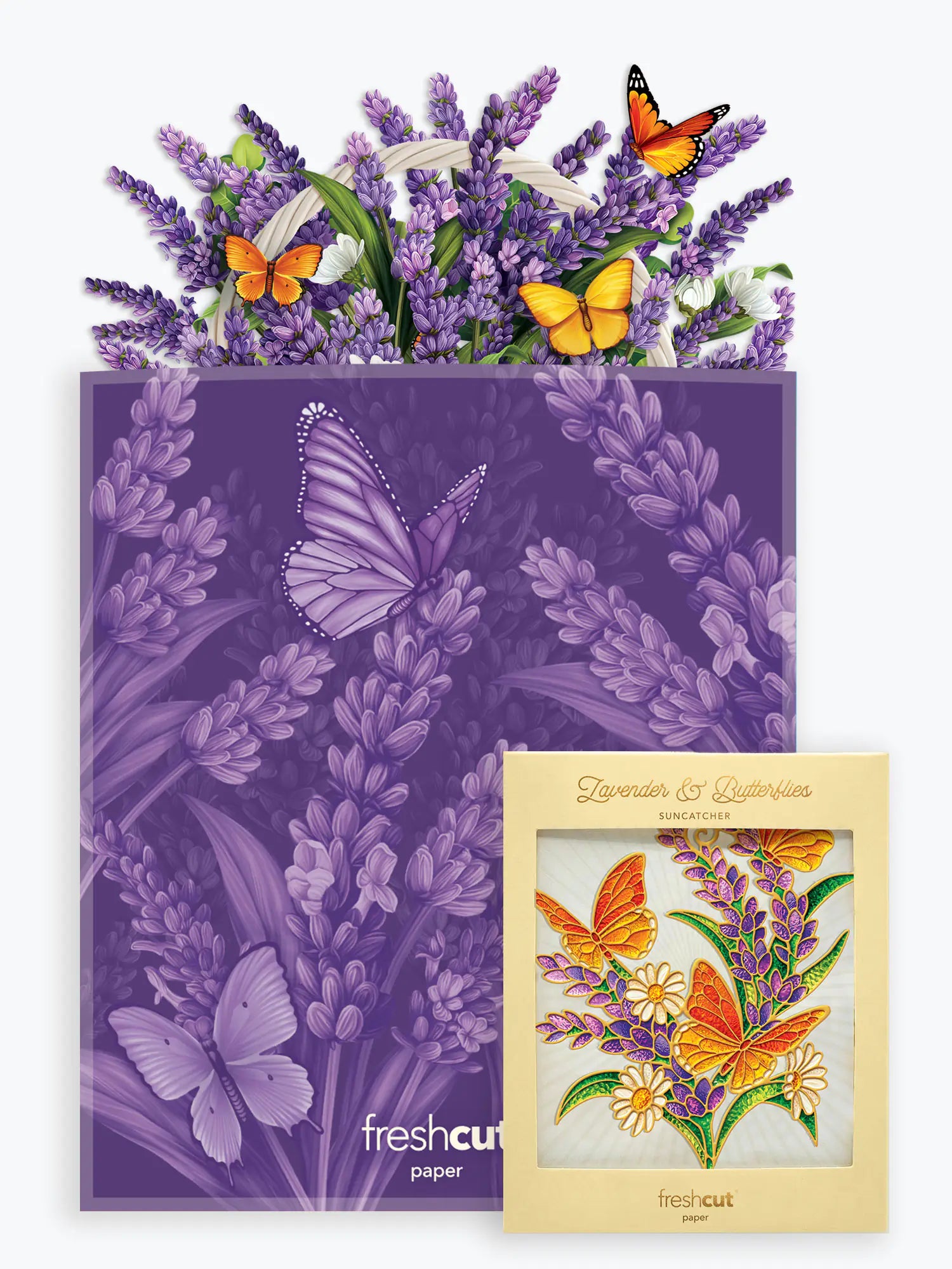 Our best selling Lavender & Butterflies bouquet now comes in this enchanting set featuring a dreamy acrylic suncatcher and matching pop-up bouquet. The suncatcher features blooming lavender and delicate butterflies, casting a soft, dreamy glow in any window, while the bouquet bursts to life with monarch butterflies and delicate purple blossoms, inspired by the fragrant lavender fields of Provence. Symbolic of tranquility and peace, this nature-inspired set makes a thoughtful and timeless gift, perfect for Mother's Day, birthdays, or any occasion worth celebrating.