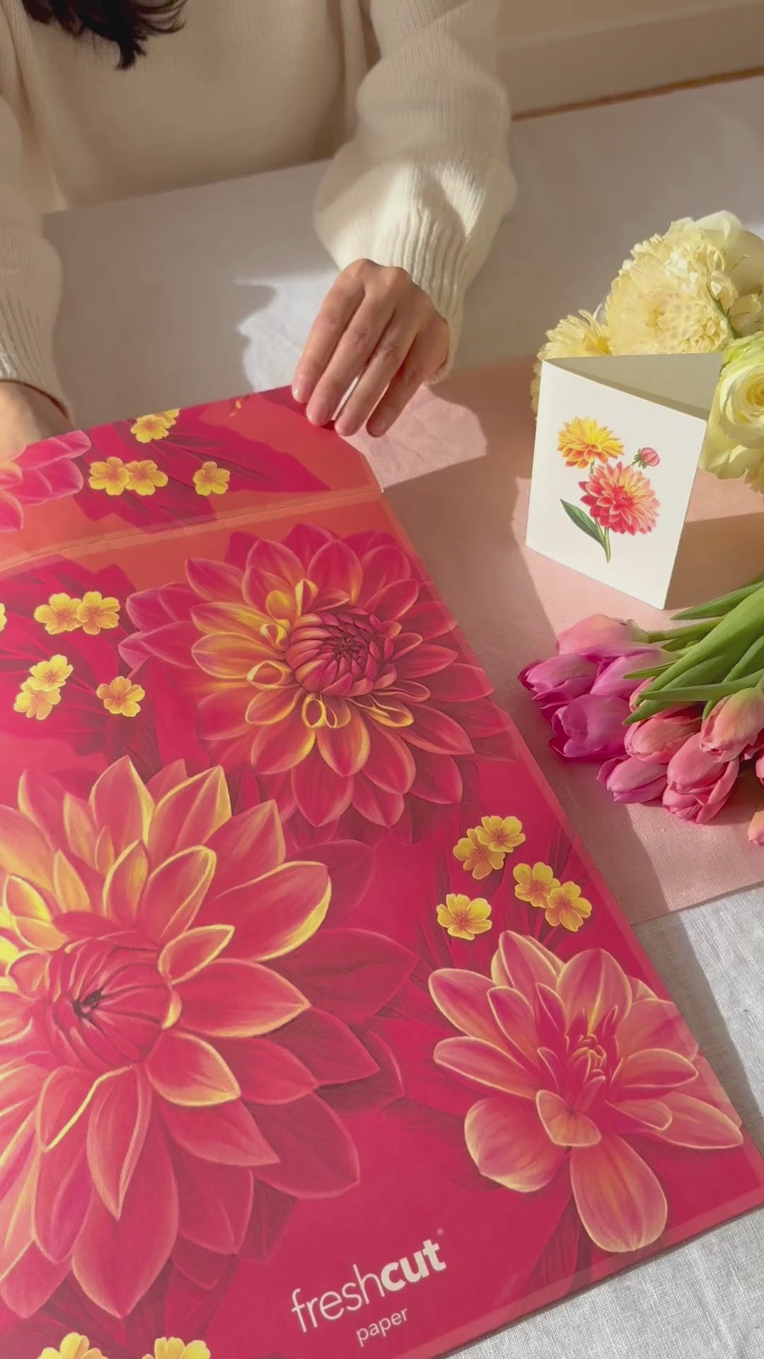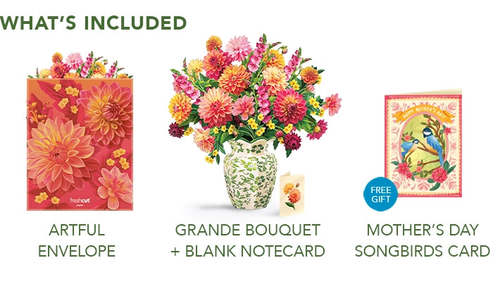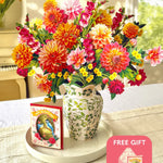 Celebrate the special women in your life with this beautifully crafted Songbirds layered card, paired with the warmth and cheer of our Grande Dahlia Sunrise Bouquet. Bursting with lush tangerine, coral, and pink blooms that capture every shade of the sunrise, this stunning duo is a heartfelt Mother's Day gift she'll treasure long after the day has passed.
