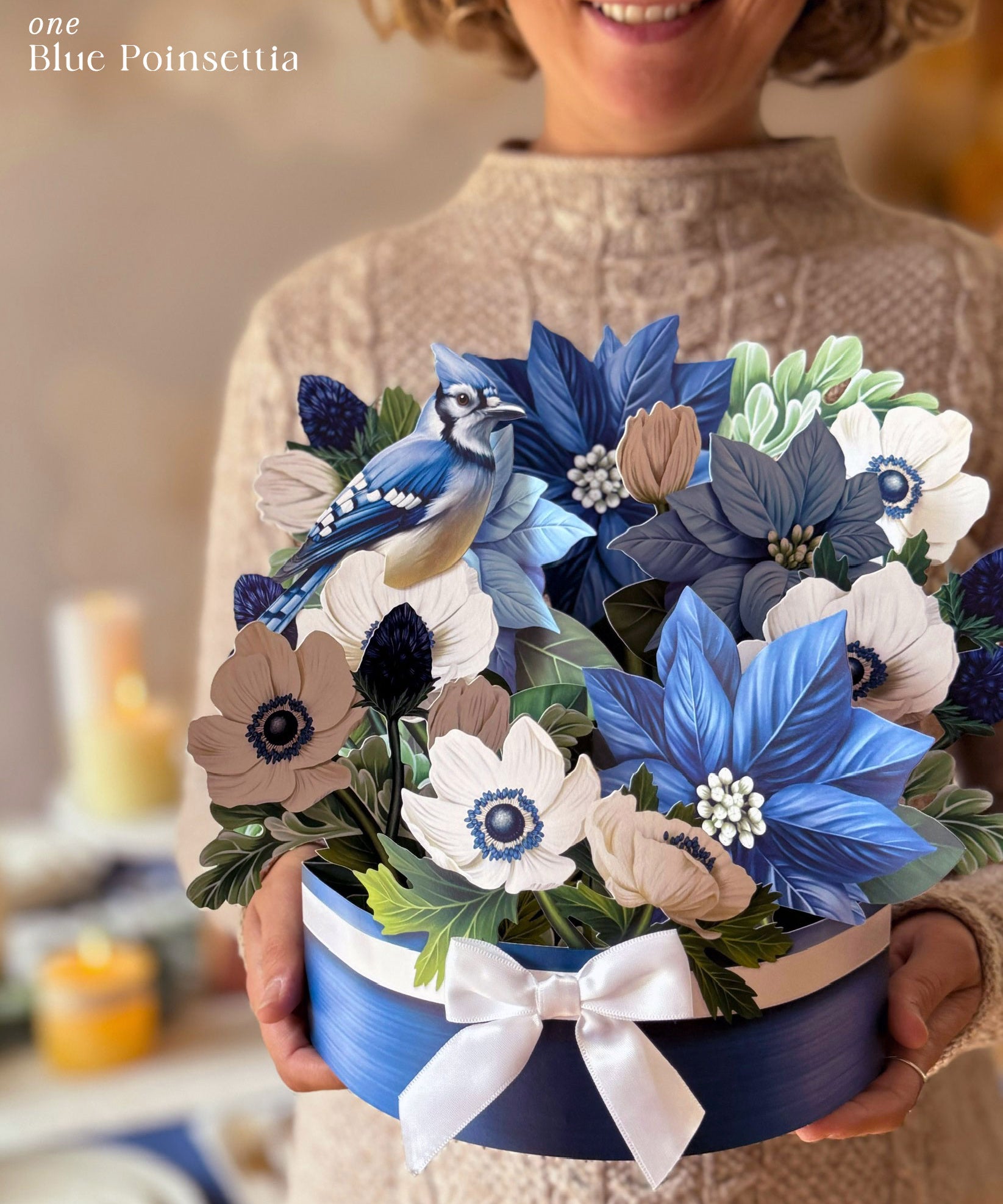 Vibrant blue poinsettias, thistles, dusty miller leaves, and snow-white anemones with a real satin bow.