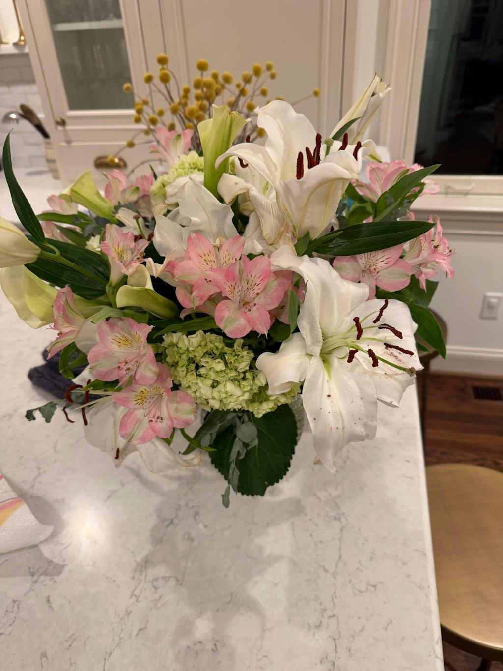 A refined arrangement bursting with organic sophistication, the Ivory & Sage Bouquet sends sentiments of comfort, kindness, and love no matter the occasion. This forever flower bouquet embodies serenity and grace in the form of crisp, white lilies and calla lilies, alongside sweet anemones, lush green hydrangeas, and eucalyptus branches in a naturalistic stone vase with a wooden trim. The perfect gift for heartfelt sympathies or a sweet gesture of understated affection.