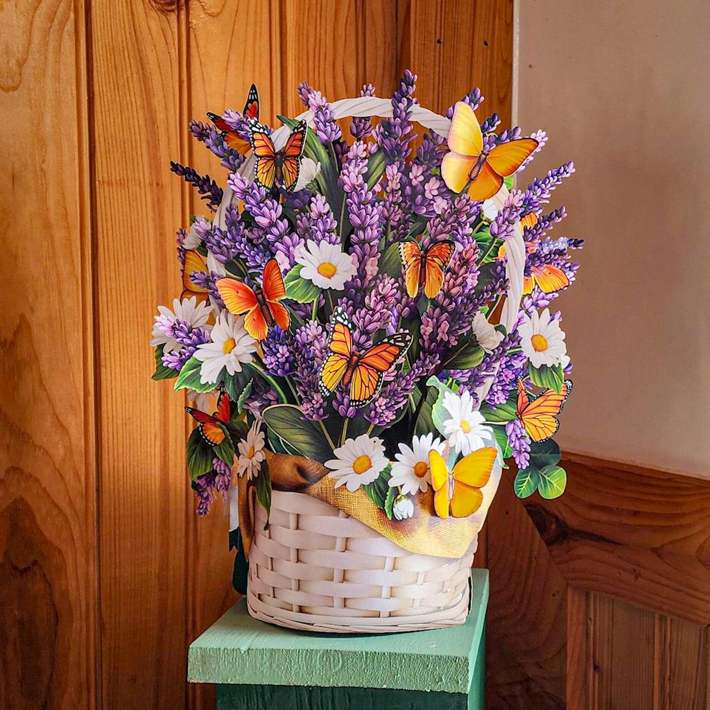 Inspired by the fragrant lavender fields of Provence, comes a charming basket full of monarch butterflies and delicate purple blossoms! This beautiful lavender pop-up card is a springtime favorite with textured and dreamy wildflowers. Symbolic of tranquility and peace, this nature inspired gift is perfect for her. With a simple pinch, the butterflies spring to life in 3D!