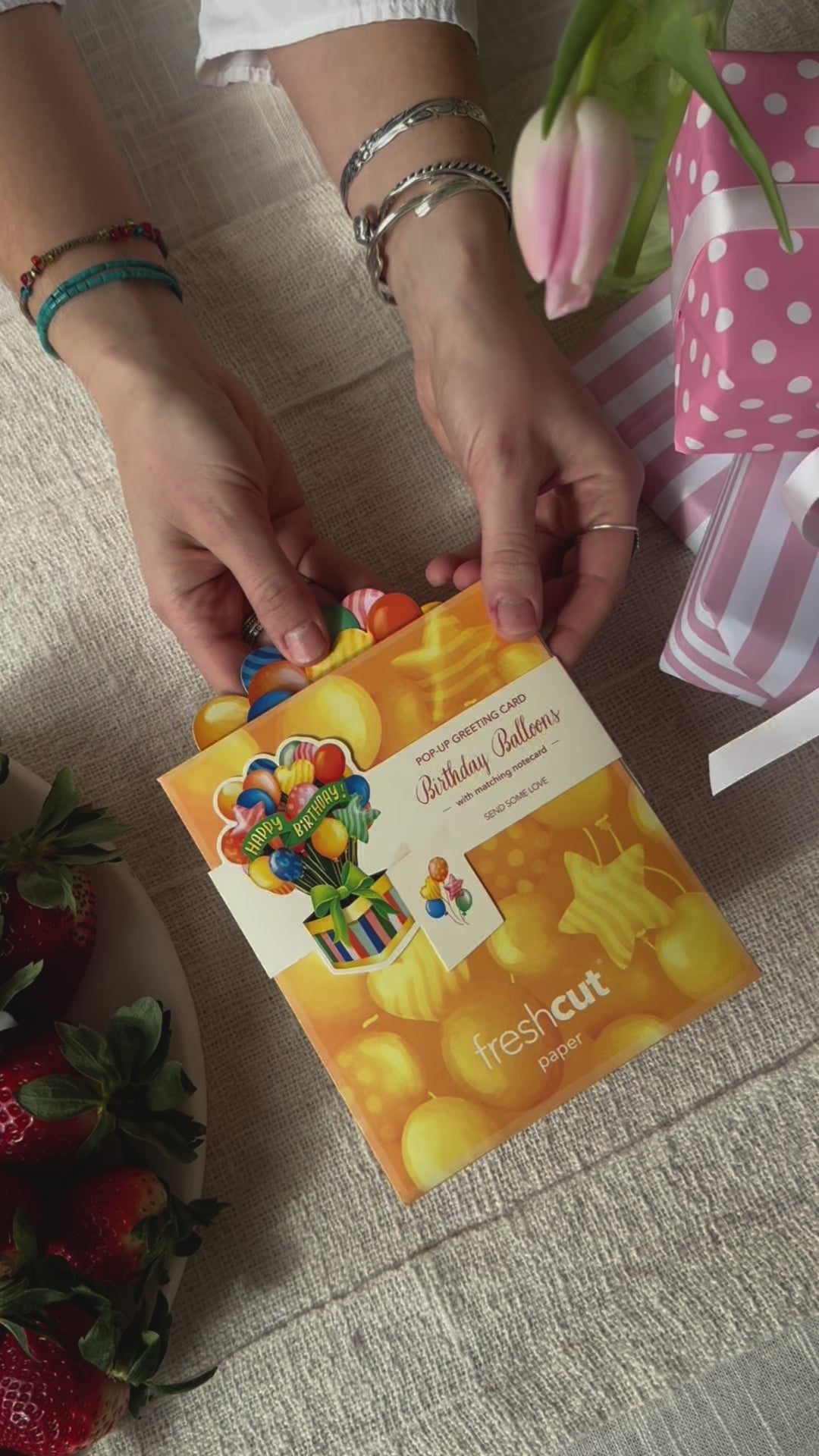This isn’t just a birthday card—it’s a mini celebration in itself! The Mini Multi-Colored Balloon Pop-Up Card unfolds to reveal a playful array of balloons in every hue, highlighted with shimmering gold-foil accents. The perfect card for birthdays that deserve a little extra sparkle.