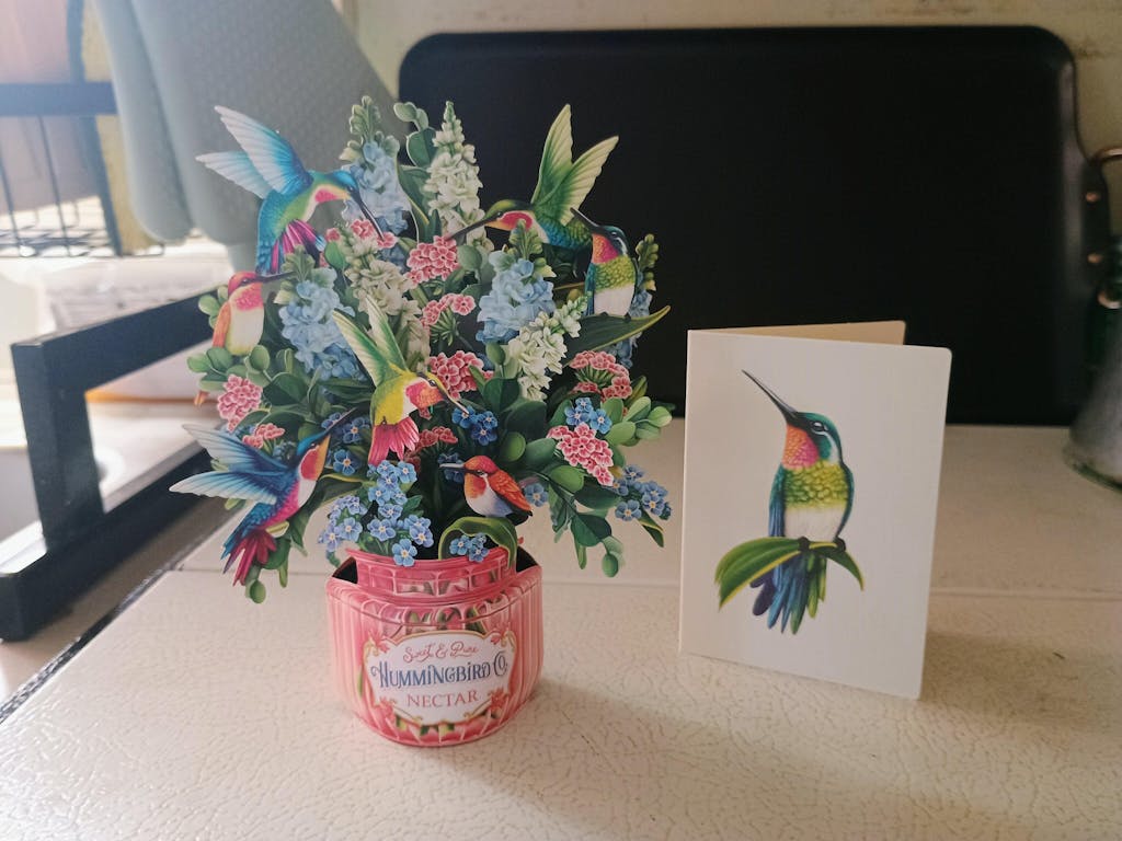 The Mini Pop-Up Hummingbird Oasis is a joyful burst of color and movement, perfect for marking all of life’s brightest occasions. A flurry of pop-up hummingbirds hovers above blooming verbena, forget-me-nots, and delphiniums, all nestled in a vintage-inspired pink glass vase. Soft greens and floral details echo the beauty of spring and summer in full bloom. Thoughtfully designed and easy to display, it’s a charming way to celebrate birthdays, milestones, or simply to bring a little sunshine indoors.