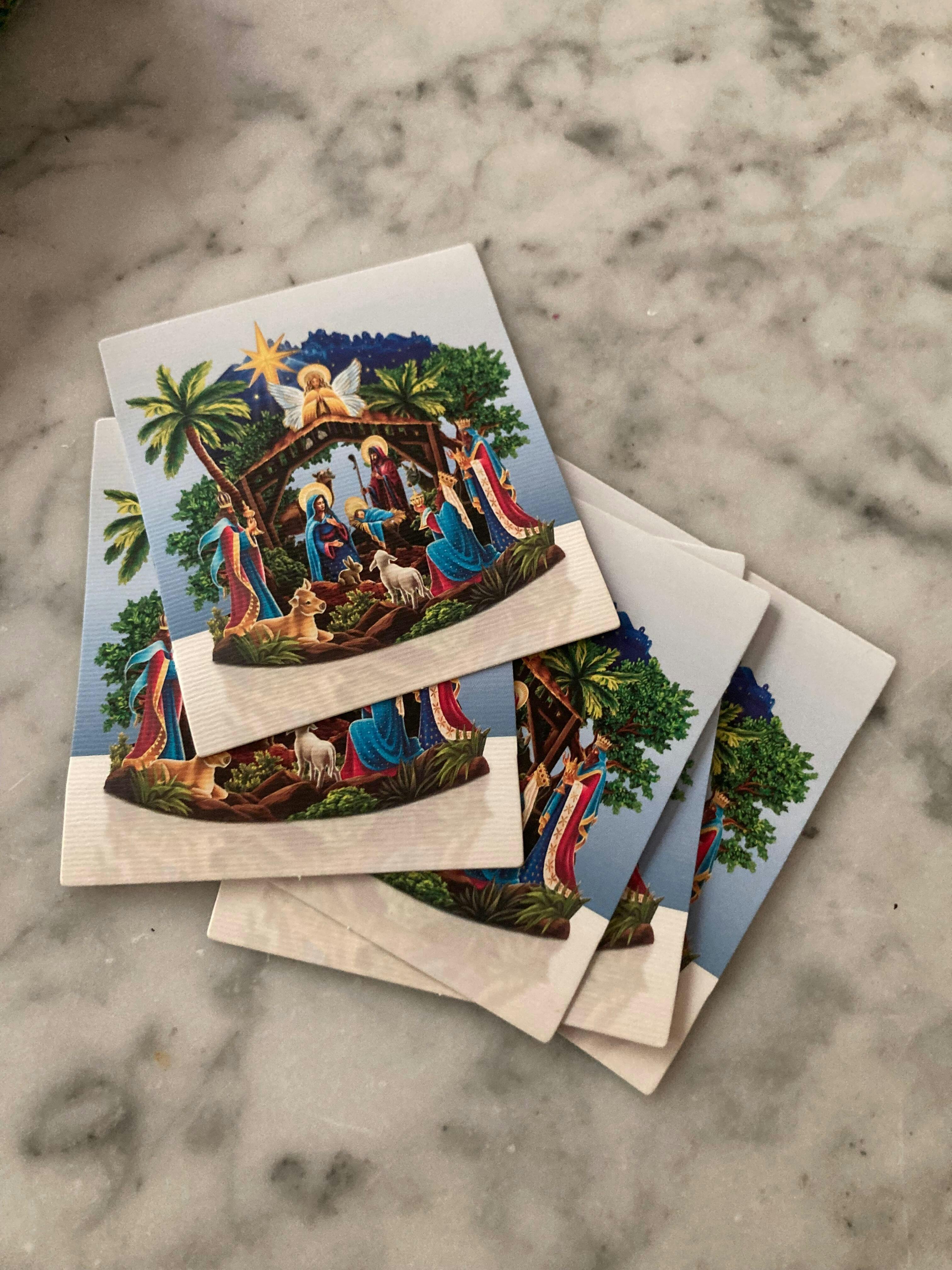 Love these mini nativity cards ! If you did away with the bands on the envelopes, it would save paper ( trees ) and maybe cost less per card for us . I did cut the picture off the bands to use as a gift tag for Christmas presents . Hate to just throw it away .