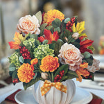 The warmth of autumn’s embrace lasts all year long with FreshCut Paper’s bold and beautiful Pumpkin Spice Bouquet. An opulent expression of sunset hues is seen in these ornately designed marigolds, garden roses, green hydrangeas, eucalyptus, red berries, and maple leaves. A nostalgic gingham bow enhances the sunshine shades, while a white pumpkin vase adds an elegant and minimalist touch. Comprised of symbols of change, renewal, friendship, and love, the Pumpkin Spice Bouquet is a gourd-ous centerpiece and charming way to send your love.