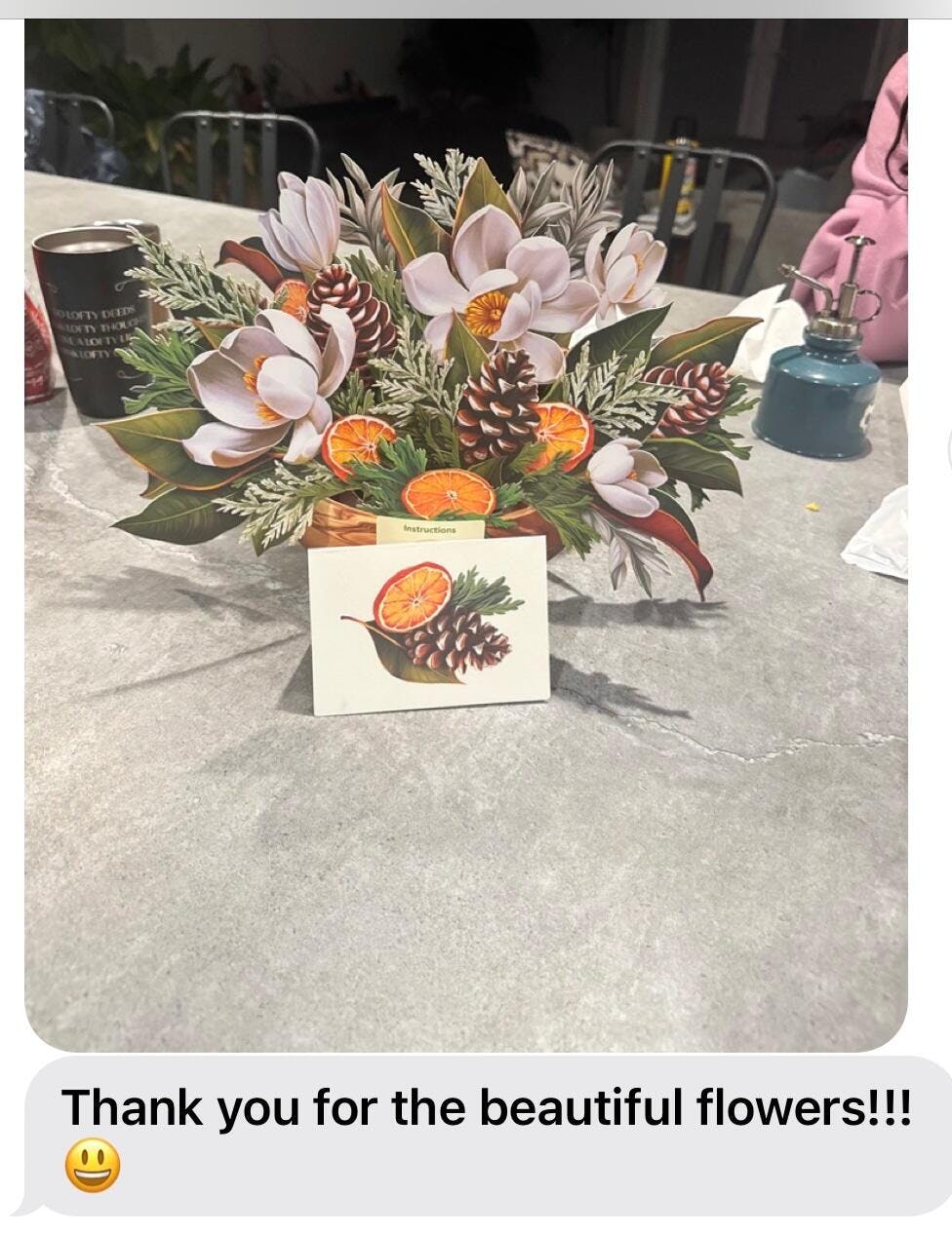 This arrived with the normal beautiful quality and rapid service of Fresh Cut Paper, and I will enjoy using it during the fall and winter. I love that it's not holiday-specific. The only improvement I would make to it is for the back to be fully dimensional rather than flat above the dimensional bowl/container. It would make a better centerpiece if it were full on both sides. I will likely have to put that idea aside and use it on the sideboard or a shelf or such rather than the table.